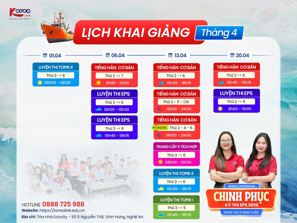 LỊCH KHAI GIẢNG CÁC KHÓA HỌC TIẾNG HÀN THÁNG 4.2026| HỌC TIẾNG HÀN TẠI NGHỆ AN