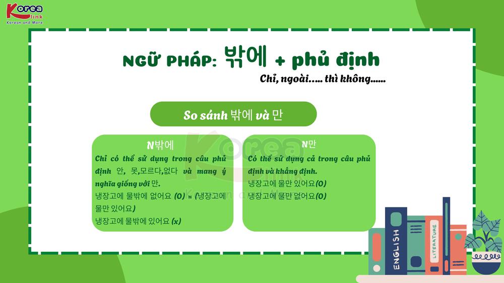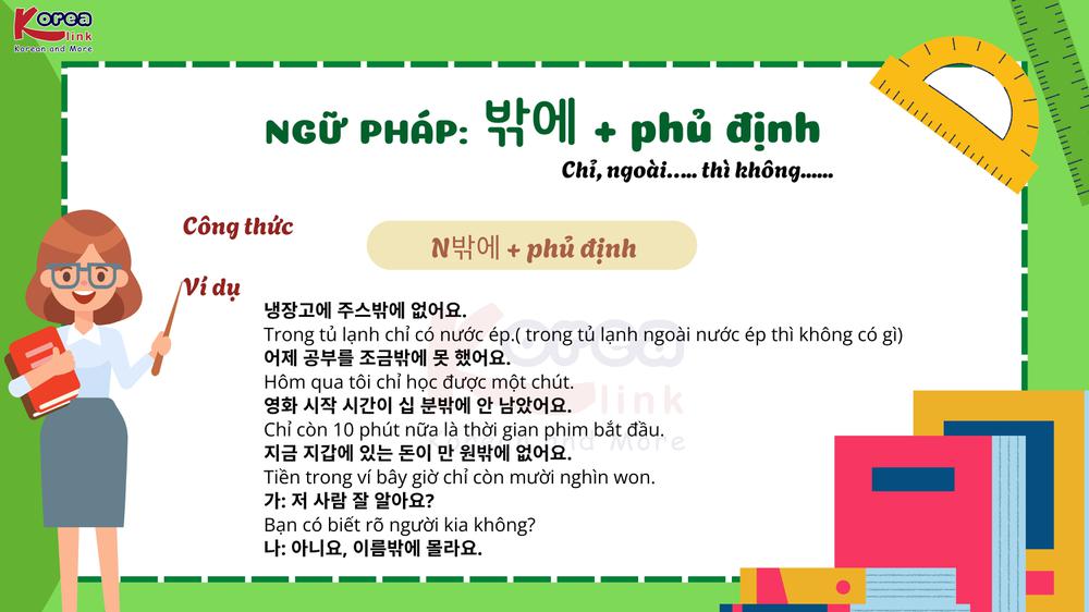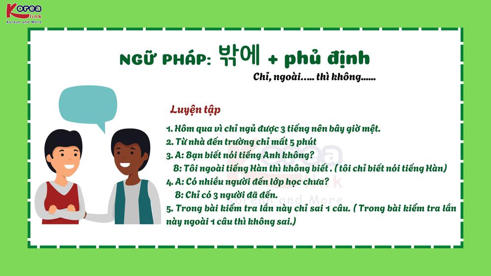 Trong tiếng Hàn, khi muốn nói “chỉ ngoài… thì không” , người Hàn dùng cấu trúc “ 밖에 + phủ định” . Đây là cách diễn đạt vừa đơn giản vừa tự nhiên , thể hiện giới hạn hoặc sự thiếu hụt nhẹ trong câu nói. Cùng Korea Link Nghệ An khám phá cách dùng “ 밖에 + phủ định” thật chuẩn, dễ hiểu và ứng dụng hiệu quả trong giao tiếp hằng ngày nhé!