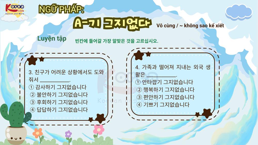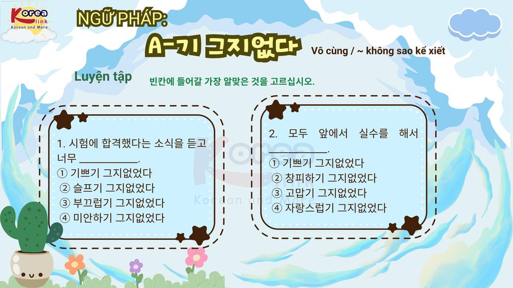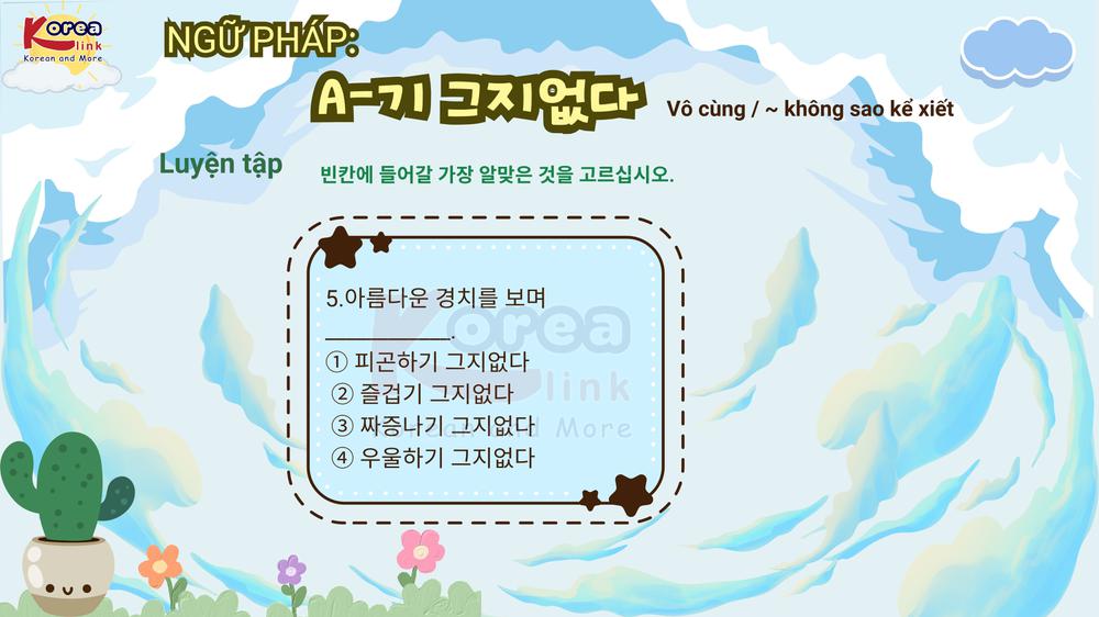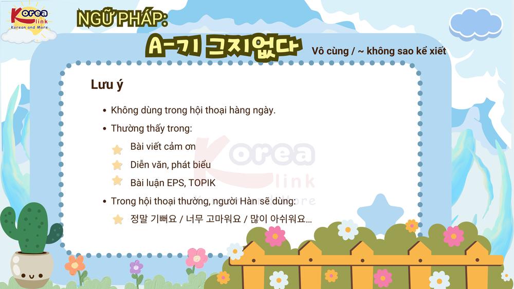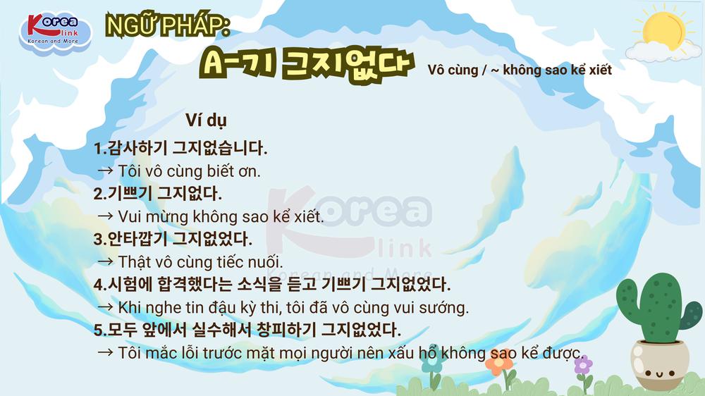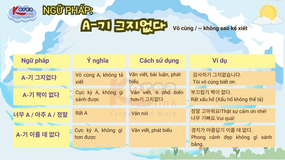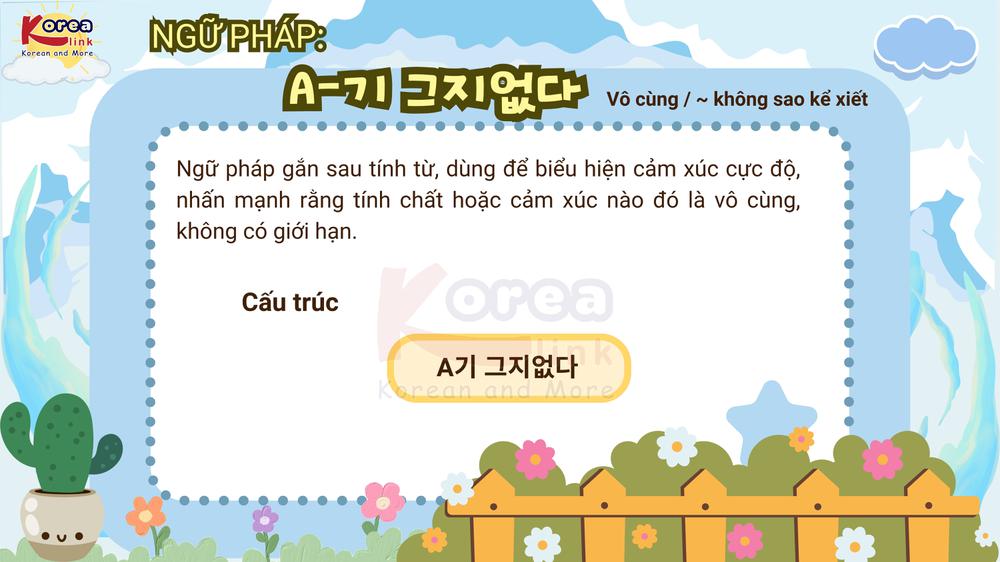 Nếu bạn từng muốn diễn tả rằng “vui không kể xiết”, “đáng tiếc vô cùng” hay “hạnh phúc hết chỗ nói”, thì A- 기 그지없다 chính là cấu trúc bạn cần nắm vững. Cùng Trung tâm Hàn ngữ Korea Link khám phá ý nghĩa, cách dùng và những ví dụ sinh động của cấu trúc thú vị này nhé!