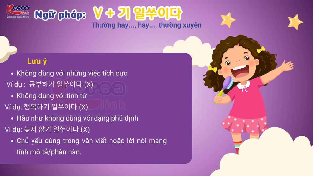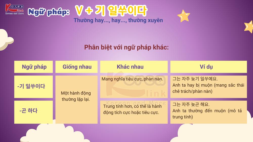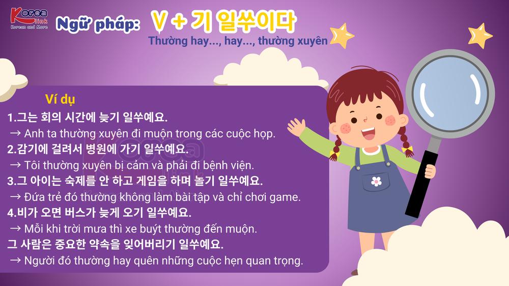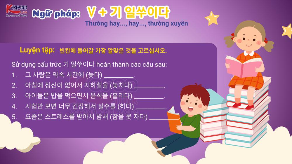 Trong hành trình học tiếng Hàn, bạn sẽ bắt gặp nhiều cấu trúc thể hiện thói quen hoặc hành vi thường xuyên xảy ra – đôi khi là những thói quen không tốt . Một trong số đó chính là V + 기 일쑤이다 , ngữ pháp được người Hàn dùng rất tự nhiên để nói về những việc thường hay xảy ra , đặc biệt là khi điều đó không mong muốn . Hãy cùng Trung tâm Hàn ngữ Korea Link tìm hiểu sâu hơn về ý nghĩa, cách sử dụng và ví dụ thực tế của cấu trúc thú vị này nhé!