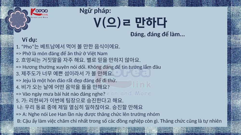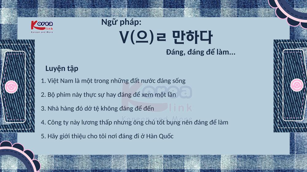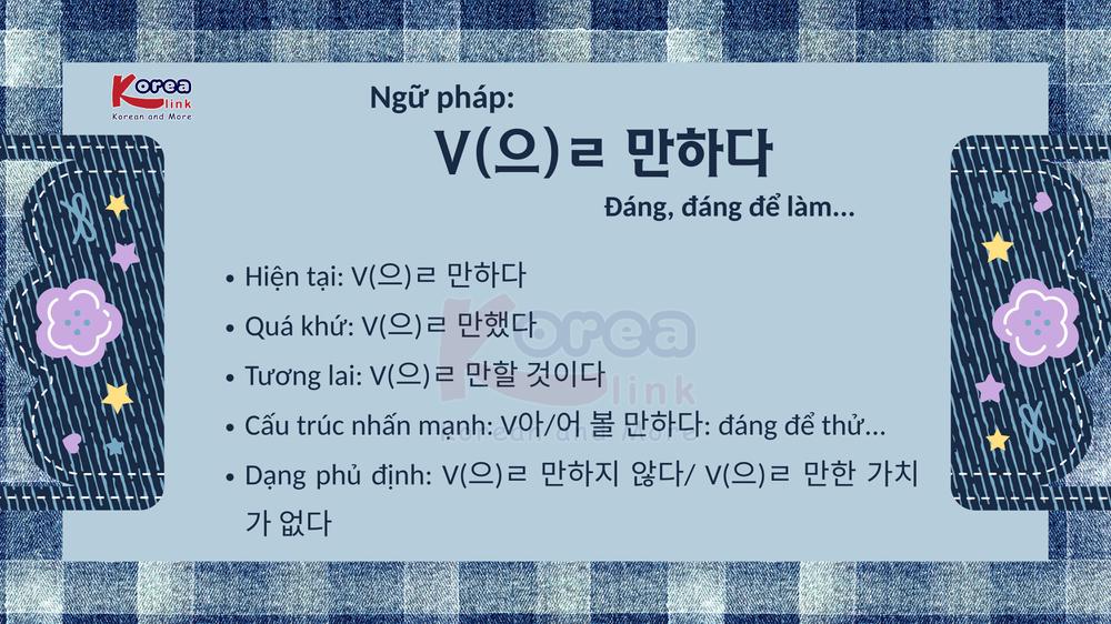 Cùng Trung tâm Ngoại ngữ Korea Link tìm hiểu cách dùng, cấu trúc và ví dụ thực tế của V( 으 ) ㄹ 만하다 để bạn có thể vận dụng trôi chảy như người bản xứ nhé!