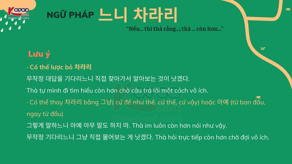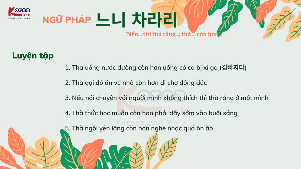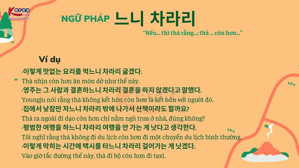 Trong bài viết này, chúng ta sẽ cùng khám phá ý nghĩa, cách dùng, sắc thái biểu hiện và các ví dụ thực tế của –느니 차라리 , giúp bạn vận dụng linh hoạt trong giao tiếp hằng ngày. Nếu bạn đang muốn nâng cao khả năng diễn đạt cảm xúc và lập luận trong tiếng Hàn, nhất định không thể bỏ qua ngữ pháp quan trọng này!