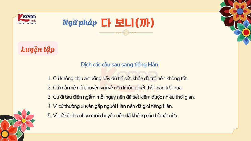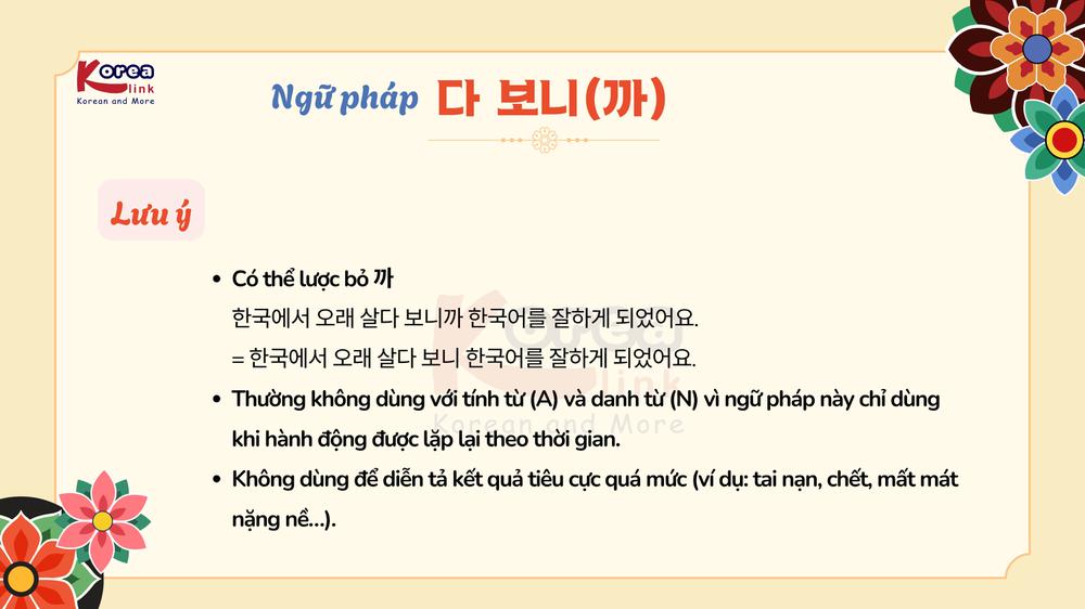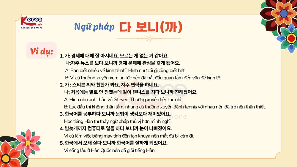 Khi học tiếng Hàn, bạn sẽ thường bắt gặp ngữ pháp 다 보니 ( 까 ) – cấu trúc được dùng để diễn tả một kết quả tự nhiên xuất hiện sau quá trình lặp lại hoặc duy trì một hành động trong thời gian dài. Đây là một điểm ngữ pháp quan trọng trong giao tiếp thực tế, giúp người học diễn đạt tự nhiên như người bản xứ. Trong bài viết này, chúng ta sẽ cùng tìm hiểu ý nghĩa, cách dùng và ví dụ của 다 보니 ( 까 ) để bạn dễ dàng áp dụng vào các tình huống đời sống và bài thi TOPIK.