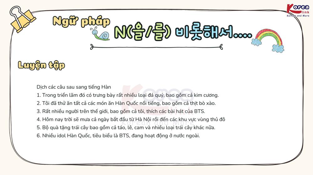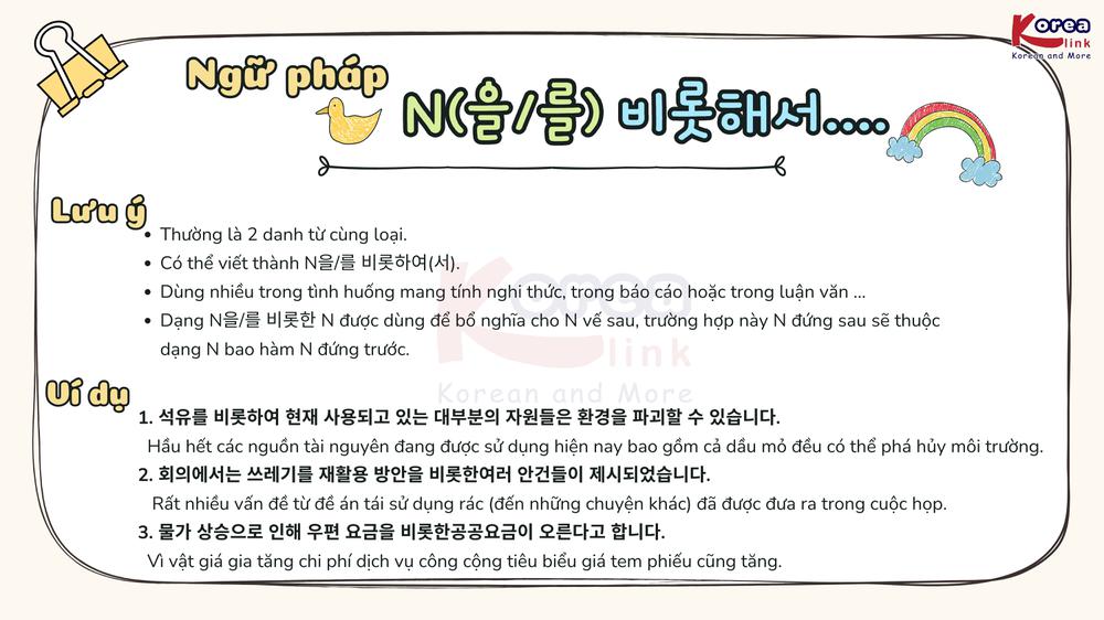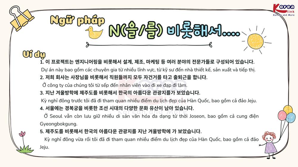 Khi bạn muốn liệt kê một loạt ví dụ mà trong đó một yếu tố được xem là tiêu biểu hoặc đứng đầu danh sách , tiếng Hàn sử dụng cấu trúc N( 을 / 를 ) 비롯해서 . Đây là ngữ pháp quan trọng giúp câu văn mạch lạc hơn, thường gặp trong bài viết học thuật, tin tức và cả đề thi TOPIK. Trong bài viết này, chúng ta sẽ cùng tìm hiểu N( 을 / 를 ) 비롯해서 nghĩa là gì, cách dùng chuẩn, lưu ý và ví dụ thực tế , giúp bạn áp dụng chính xác vào giao tiếp và viết luận.