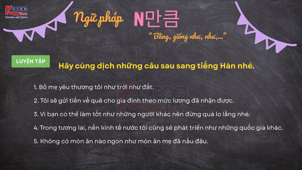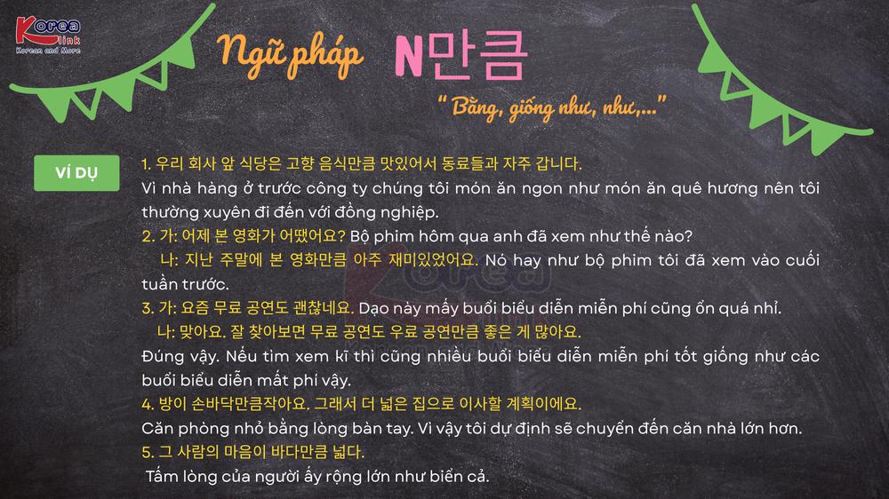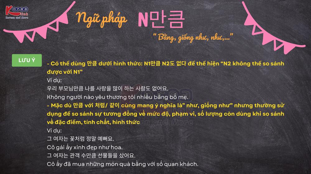 Trong tiếng Hàn, khi muốn so sánh mức độ, quy mô hoặc thể hiện sự tương đương giữa hai đối tượng, cấu trúc N 만큼 là một trong những ngữ pháp được dùng phổ biến nhất. Với nghĩa “ bằng… , tương đương với… , đến mức như… ”, N만큼 giúp câu văn trở nên tự nhiên và mang tính so sánh cụ thể hơn. Đây là một ngữ pháp quan trọng xuất hiện nhiều trong giao tiếp đời sống, sách học tiếng Hàn cũng như các kỳ thi TOPIK. Bài viết dưới đây sẽ giúp bạn hiểu rõ ý nghĩa, cách dùng, lưu ý ngữ pháp và ví dụ minh họa để bạn dễ dàng áp dụng N만큼 đúng chuẩn và hiệu quả.