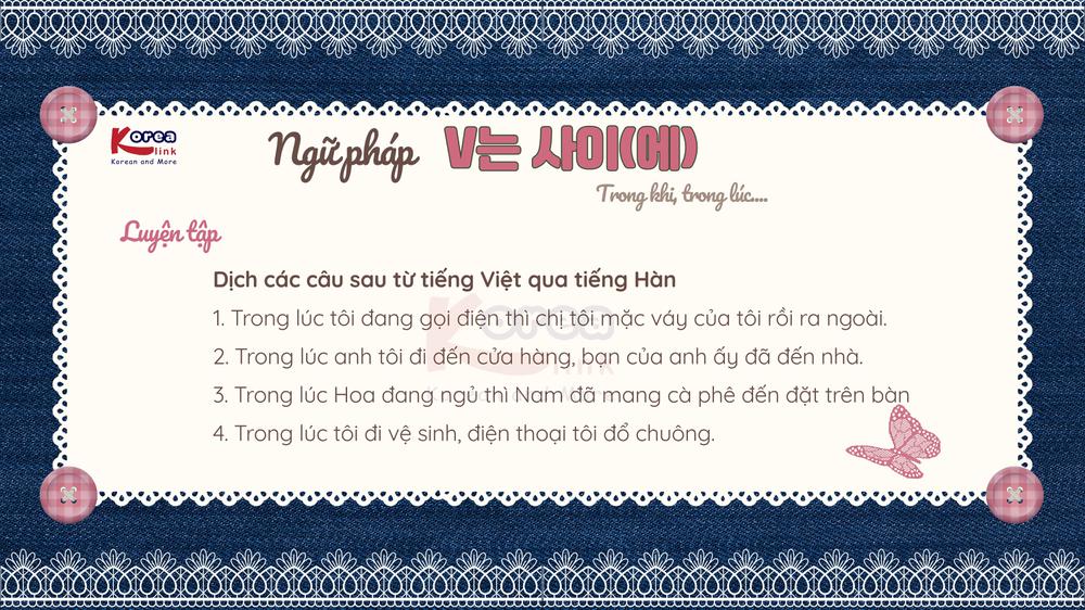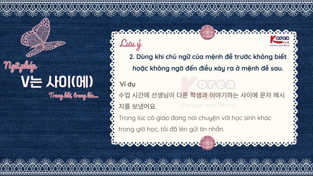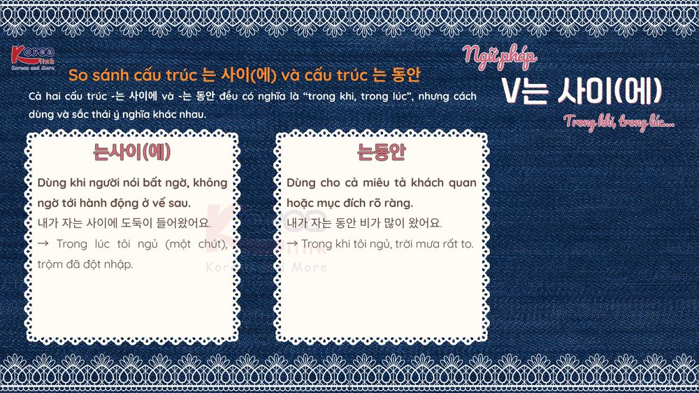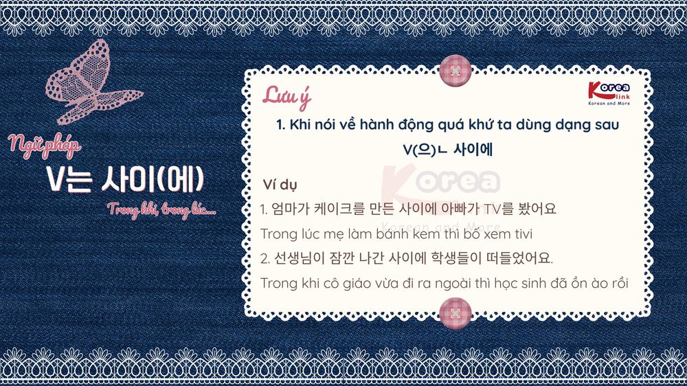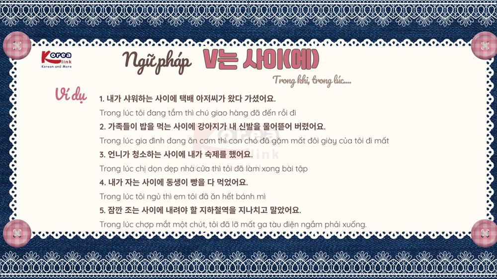Trong bài viết này, chúng ta sẽ cùng tìm hiểu ý nghĩa, cấu trúc, cách sử dụng, ví dụ thực tế của ngữ pháp V 는 사이 ( 에 ) để bạn có thể áp dụng dễ dàng trong học tập cũng như giao tiếp hàng ngày.
