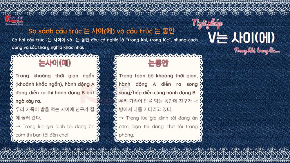 Trong giao tiếp tiếng Hàn hằng ngày, bạn sẽ thường xuyên cần diễn đạt những hành động xảy ra song song hoặc trong cùng một khoảng thời gian . Ngữ pháp V 는 사이 ( 에 ) là một cấu trúc quan trọng giúp biểu đạt chính xác ý nghĩa “trong lúc…”, “trong khi…” theo cách tự nhiên giống người Hàn. Đây là dạng ngữ pháp xuất hiện nhiều trong bài nghe, bài đọc và đề thi TOPIK, nên nắm vững cách dùng V는 사이(에) sẽ giúp bạn cải thiện rõ rệt khả năng diễn đạt và hiểu ngôn ngữ.