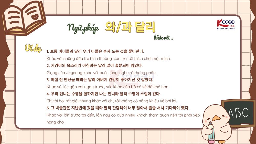 Trong quá trình học tiếng Hàn, bạn sẽ thường xuyên bắt gặp cấu trúc 와 / 과 달리 , một ngữ pháp quan trọng dùng để so sánh sự khác biệt giữa hai người, hai sự vật hoặc hai tình huống. Cấu trúc này mang nghĩa “khác với…”, “trái với…”, “không giống như…” , giúp câu văn trở nên rõ ràng, mạch lạc và mang sắc thái diễn đạt chuẩn người Hàn. Đây là dạng ngữ pháp xuất hiện nhiều trong hội thoại hằng ngày, bài đọc, bài viết và đề thi TOPIK.