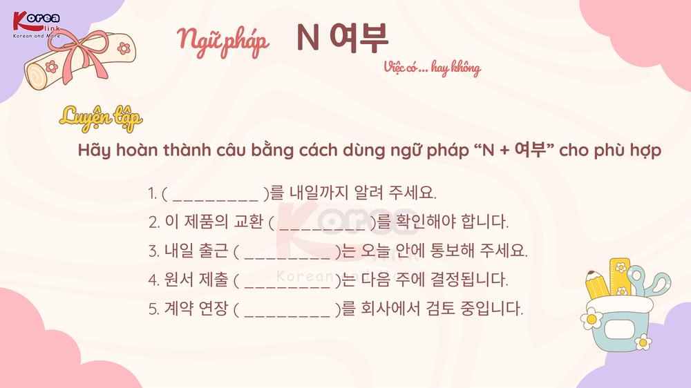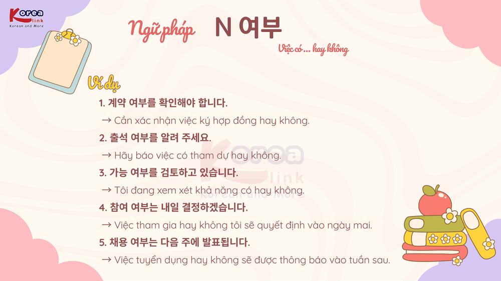 Nếu bạn đang muốn nâng cấp khả năng đọc – viết tiếng Hàn lên cấp độ chuyên nghiệp hơn, thì nắm vững ngữ pháp N 여부 là điều không thể thiếu. Trong bài viết này, chúng ta sẽ cùng khám phá ý nghĩa, cách dùng, và ví dụ thực tế giúp bạn sử dụng cấu trúc này một cách chuẩn xác, tự nhiên và hiệu quả.