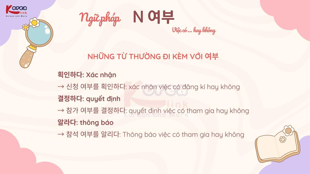 Khi đọc tài liệu, email công việc hay các bài viết học thuật bằng tiếng Hàn, bạn sẽ rất dễ bắt gặp cấu trúc N 여부 – một ngữ pháp quan trọng dùng để diễn đạt sự “có hay không”, “đúng hay không” của một sự việc . Đây là cách diễn đạt mang tính trang trọng, trung tính , thường xuất hiện trong văn viết, thông báo, biểu mẫu và các tình huống cần tính chính xác cao.