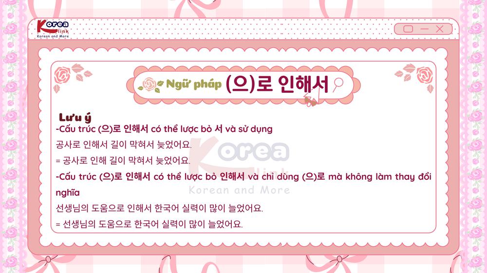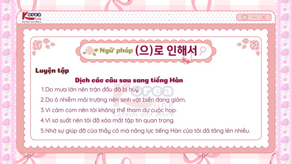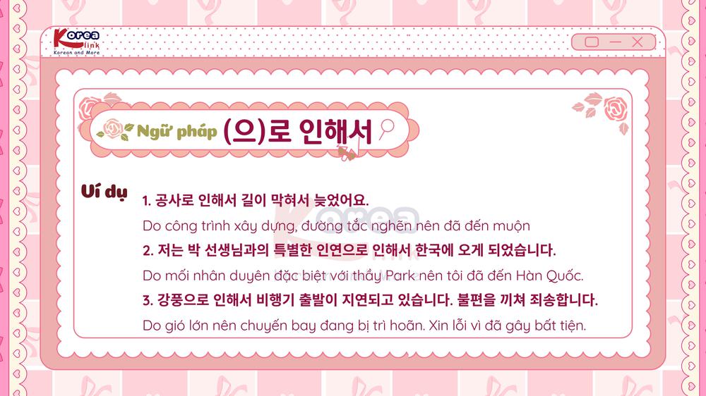 Ngữ pháp tiếng Hàn ( 으) 로 인해서 là một cấu trúc quan trọng dùng để diễn tả nguyên nhân – kết quả , mang sắc thái trang trọng và thường xuất hiện trong văn viết, thông báo, tin tức hoặc các bài luận học thuật. Cấu trúc này giúp người học trình bày lý do một cách rõ ràng, logic, đặc biệt khi nói về các kết quả mang tính khách quan hoặc hệ quả rõ rệt . Việc nắm vững ( 으) 로 인해서 sẽ giúp câu văn trở nên mạch lạc, chính xác và phù hợp với ngữ cảnh trang trọng.