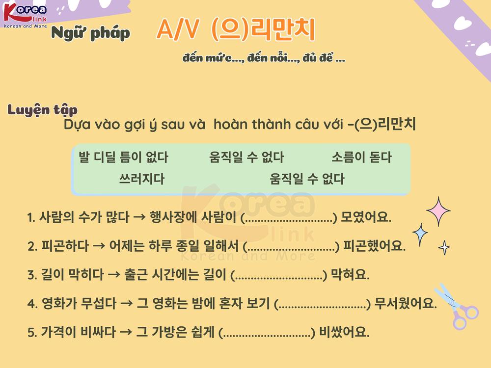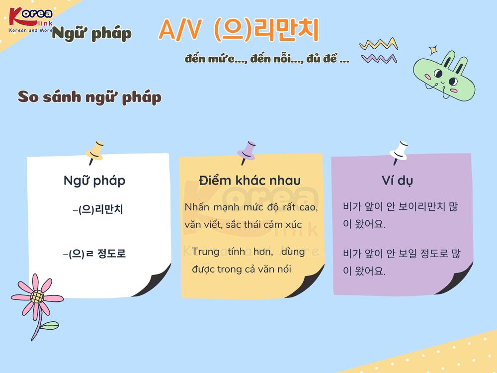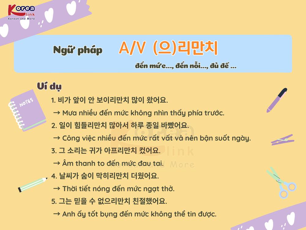 A/V – ( 으) 리만치 là ngữ pháp dùng để diễn tả mức độ cao của hành động hoặc trạng thái , đủ để tạo thành tiêu chuẩn so sánh và khiến người khác phải công nhận. Cấu trúc này thường xuất hiện trong giao tiếp thực tế, đề thi TOPIK và EPS-TOPIK , giúp câu văn trở nên tự nhiên, giàu sắc thái và thuyết phục hơn .