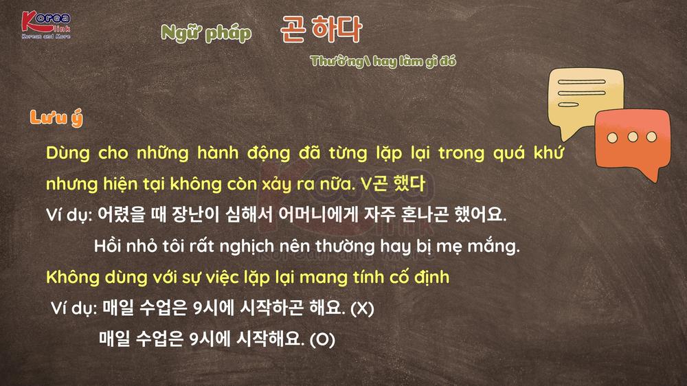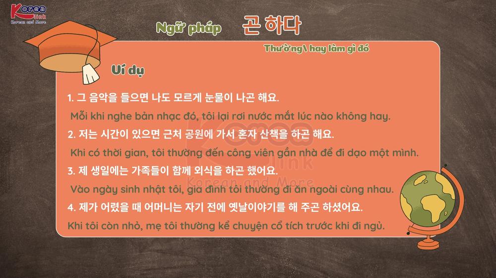 Trong tiếng Hàn, khi muốn nhắc lại những thói quen hoặc hành động đã từng diễn ra lặp đi lặp lại trong quá khứ, người bản xứ thường sử dụng 곤 하다. Ngữ pháp này giúp người học tái hiện trải nghiệm một cách tự nhiên, mềm mại, làm cho câu văn mang sắc thái hồi tưởng và gần gũi, rất thường gặp trong giao tiếp đời sống, bài viết kể chuyện cũng như các kỳ thi TOPIK, EPS-TOPIK.
