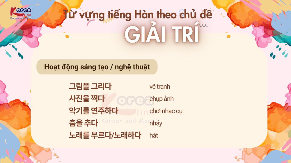 Trên đây là những từ vựng cơ bản về chủ đề giải trí trong tiếng Hàn. Hãy ôn tập thường xuyên và áp dụng vào thực tế để ghi nhớ tốt hơn. Chúc bạn học tập vui vẻ và hiệu quả!