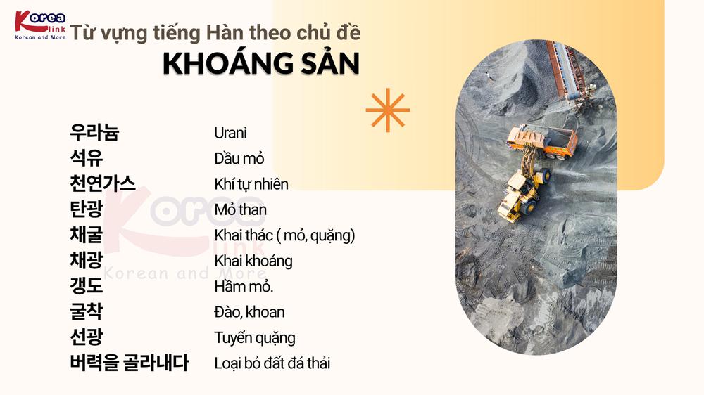 Khoáng sản là một nguồn tài nguyên thiên nhiên phong phú mà đất trời ban tặng cho con người. Hôm nay, hãy cùng Trung tâm Korealink tìm hiểu từ vựng về khoáng sản và khai thác khoáng sản – Phần 1 nhé!