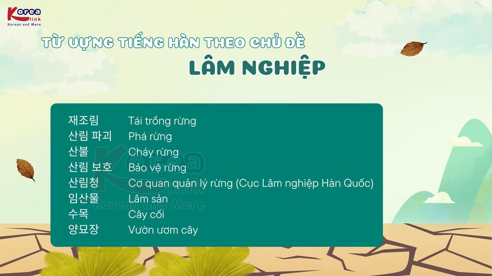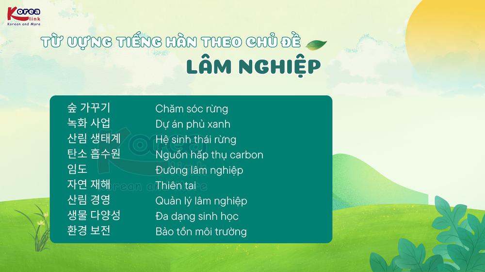 Nếu bạn đang học tiếng Hàn và quan tâm đến môi trường, sinh thái hoặc làm việc trong lĩnh vực nông – lâm nghiệp, bộ từ vựng chuyên ngành dưới đây sẽ là tài liệu không thể thiếu.