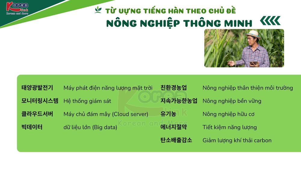 Trên đây là các từ vựng tiếng Hàn liên quan đến chủ đề Nông nghiệp thông minh . Mong rằng qua những từ này, không chỉ giúp các bạn học thêm từ mới nâng cao kiến thức tiếng Hàn mà còn có thể giúp các bạn hiểu rõ hơn về công nghệ mới để chúng ta cùng nhau hướng tới một tương lai xanh, sạch và khỏe mạnh hơn.