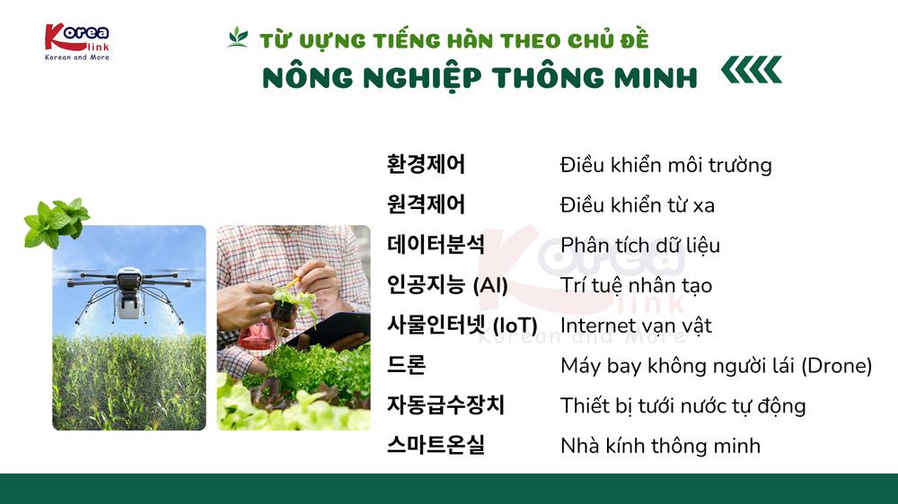 Ngày nay, nông nghiệp không chỉ đơn thuần là trồng trọt, mà còn phát triển thành một ngành công nghiệp mới ứng dụng công nghệ hiện đại. Đặc biệt, “Nông nghiệp thông minh” là phương pháp đổi mới, sử dụng trí tuệ nhân tạo, internet vạn vật và dữ liệu lớn để quản lý cây trồng hiệu quả và năng xuất trong nông nghiệp. Sau đây là các từ vựng liên quan đến nông nghiệp thông minh, các bạn hãy xem để cung cấp cho bản thân thêm một chút từ vựng mới trong kiến thức tiếng Hàn nhé.