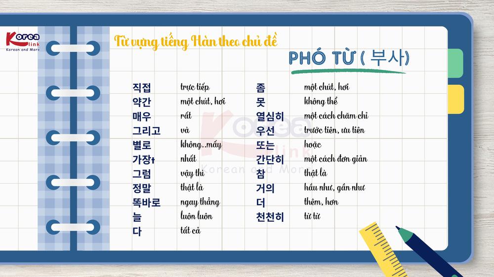Phó từ trong tiếng Hàn là những từ thường đứng trước tính từ, trạng từ, động từ hoặc đứng đầu câu. Phó từ này bổ nghĩa cho từ hoặc cho câu đó. Phó từ giúp cho câu trở nên rõ ràng, cụ thể và tránh nhầm lẫn về ý nghĩa câu.