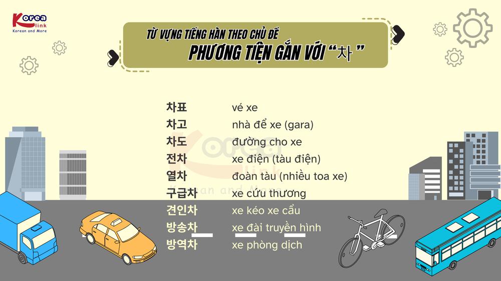 Trong tiếng Hàn, từ “차 ” có nghĩa là “xe”. Đây là một thành phần xuất hiện trong rất nhiều từ ghép chỉ các loại phương tiện giao thông. Việc nắm vững các từ vựng có chứa “차” sẽ giúp người học dễ dàng giao tiếp trong cuộc sống hằng ngày, đặc biệt là khi làm việc tại Hàn Quốc trong các ngành công nghiệp, xây dựng hoặc giao thông.