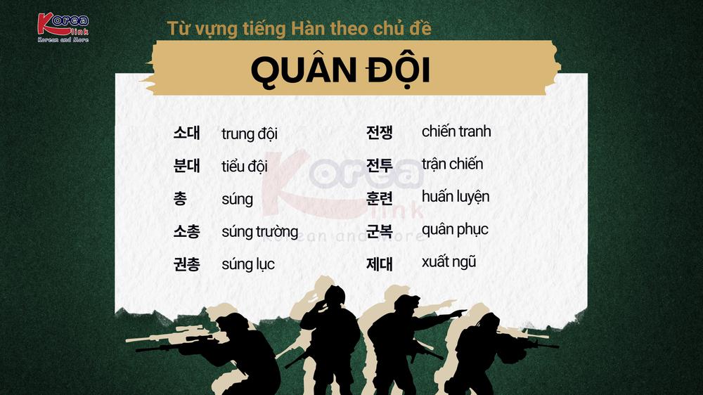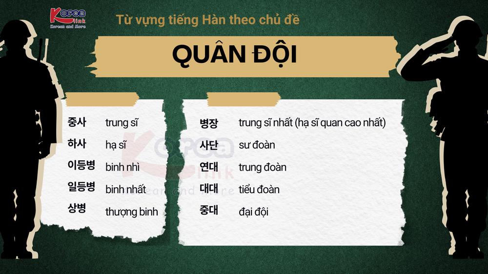 Trong tiếng Hàn, các từ vựng liên quan đến quân đội rất phong phú và đa dạng, bao gồm quân hàm, tổ chức đơn vị, vũ khí, cũng như những khái niệm về chiến đấu và huấn luyện. Việc nắm vững nhóm từ này sẽ giúp người học dễ dàng tiếp cận các văn bản, tin tức hoặc cuộc trò chuyện có liên quan đến lĩnh vực quân sự. Dưới đây là những từ vựng cơ bản và thường gặp về quân đội trong tiếng Hàn.