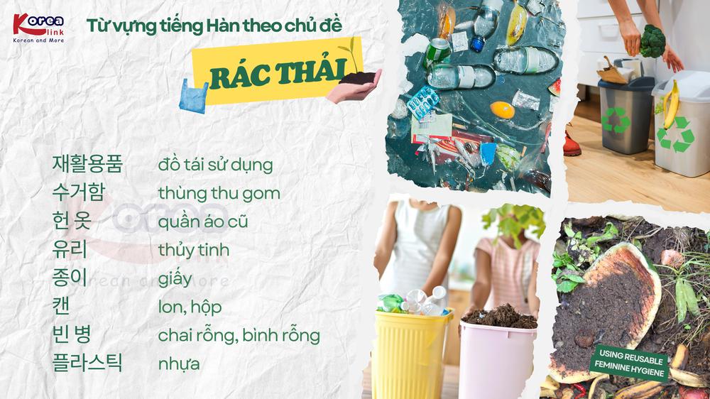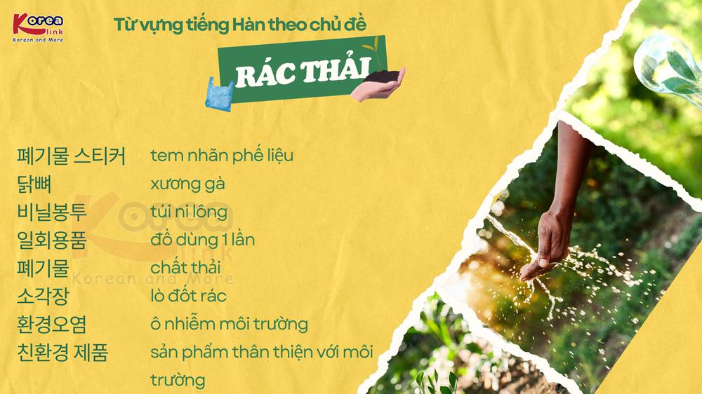 Chào các bạn, với tình hình xã hội đang ngày càng phát triển như hiện nay vấn đề ô nhiễm môi trường ngày càng trầm trọng thì từ vựng về ‘Rác thải’ thực sự rất cần cho các bạn đang học tiếng Hàn như chúng ta. Vậy nên ở bài viết tuần này mời bạn đọc cùng Trung Tâm Tiếng Hàn Korea Link tìm hiểu các từ vựng về Rác Thải trong tiến Hàn nhé!