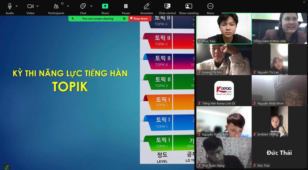 Lớp học được tổ chức theo hình thức trực tuyến, giúp học viên dễ dàng tham gia học tập dù ở bất kỳ đâu, đồng thời vẫn đảm bảo chất lượng giảng dạy, tính tương tác và tiến độ học tập theo đúng lộ trình đào tạo của Korea Link.