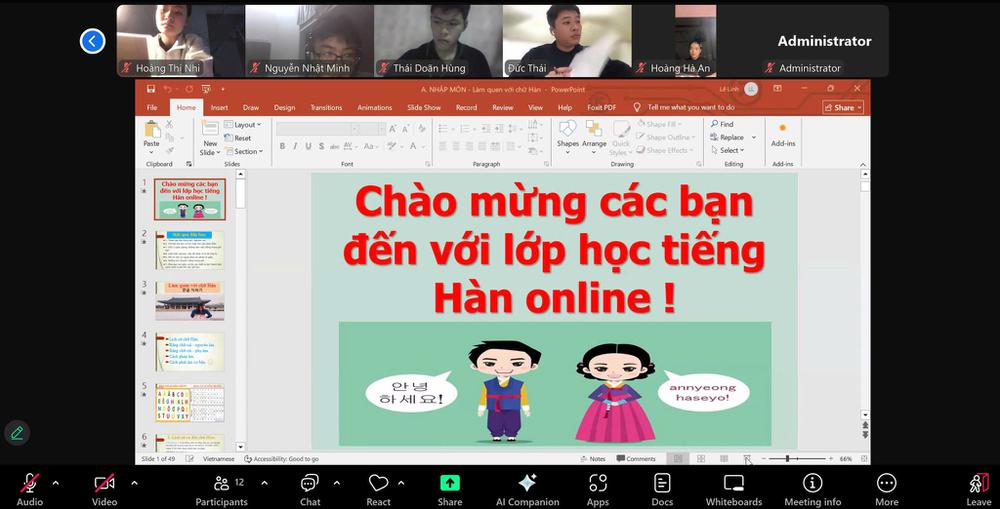 Ngay từ những buổi học đầu tiên, lớp đã đi vào ổn định với nội dung tập trung xây dựng nền tảng tiếng Hàn cơ bản , làm quen với phương pháp học, cách ghi nhớ từ vựng, phát âm và tiếp cận ngữ pháp một cách hệ thống. Giảng viên trực tiếp theo sát lớp, hướng dẫn chi tiết và hỗ trợ học viên trong suốt quá trình học online.